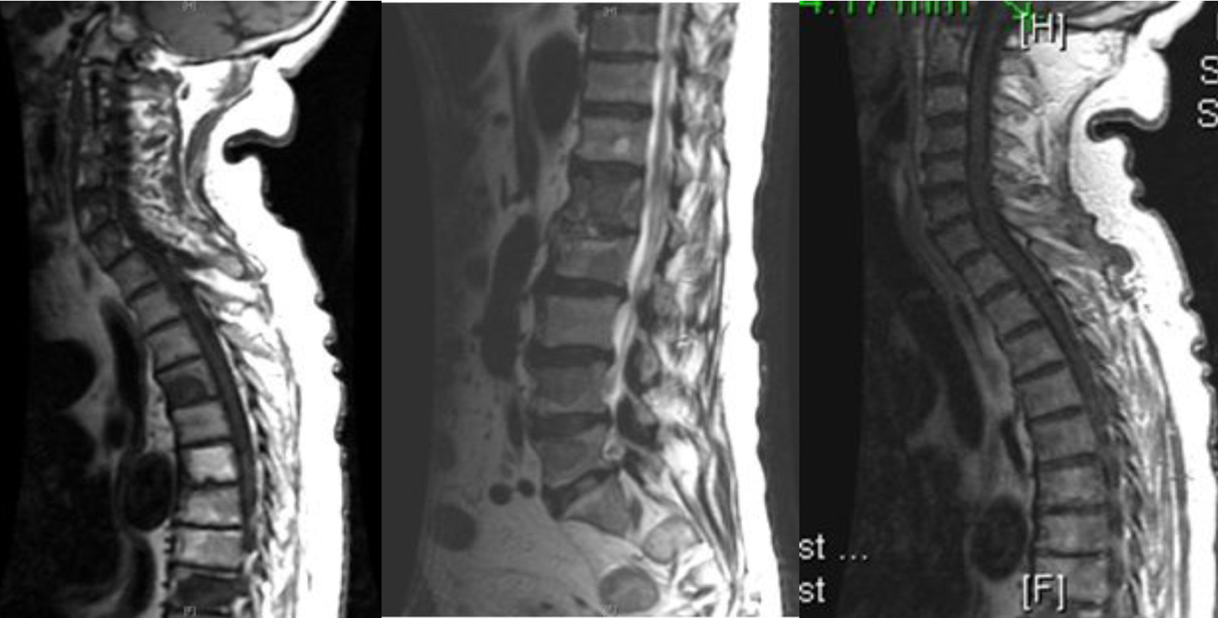 ![]() Click for large image | Figure 3. MRI of the spine showing multi-level osseous metastatic infiltration throughout the spinal axis particularly involving the lower thoracic and lumbar regions. |