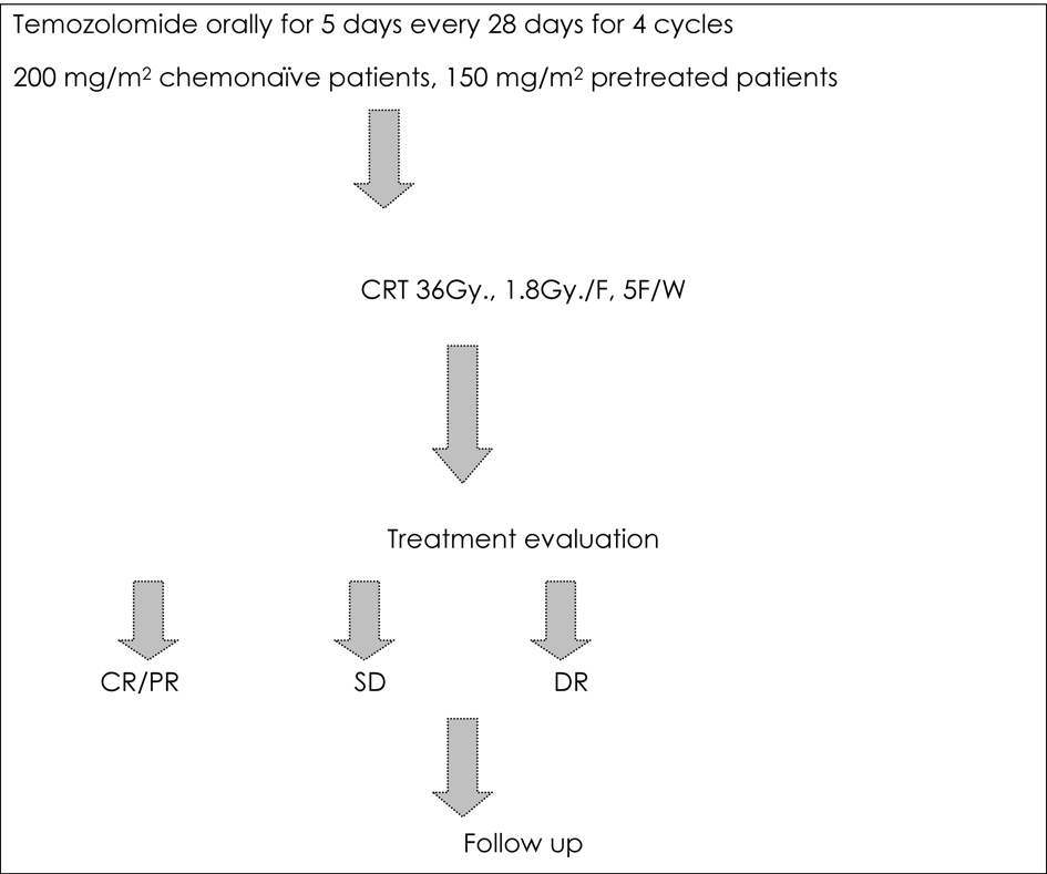 The study design is shown in Figure 1. While on temozolomide, patients were advised to receive prophylaxis against pneumocystis carinii pneumonia (PCP) especially in the first two cycles, and antiemetic prophylaxis from day 1 to day 10 of each cycle.