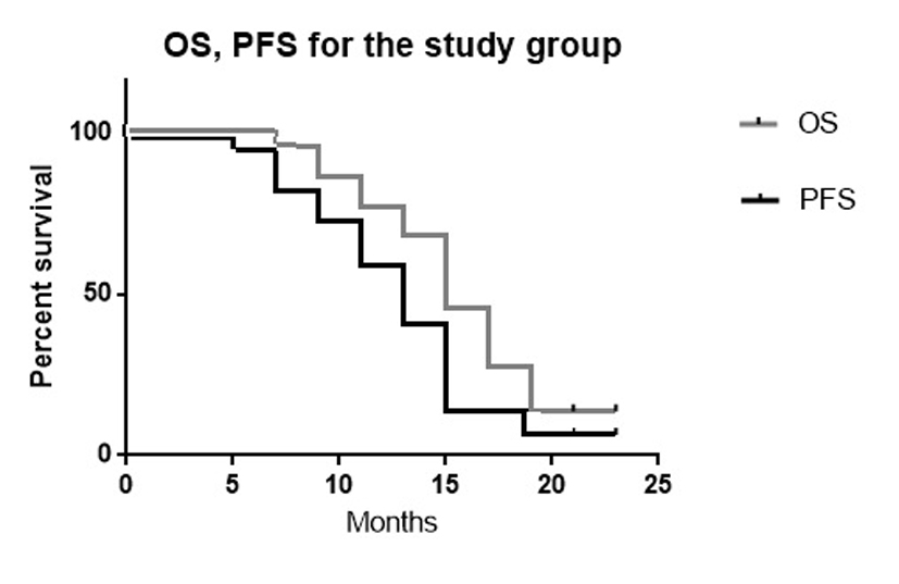 The mean OS was 16 months (range, 6 - 24 months). The median OS was 15.5 months. The mean PFS of the study group was 14.1 months (range, 5 - 24 months). The median PFS was 14 months.