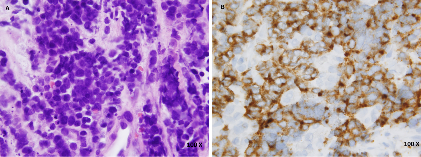 ![]() Click for large image | Figure 1. (A) Hematoxylin and eosin (H&E) staining of cervical biopsy. (B) Synaptophysin staining of cervical biopsy. |