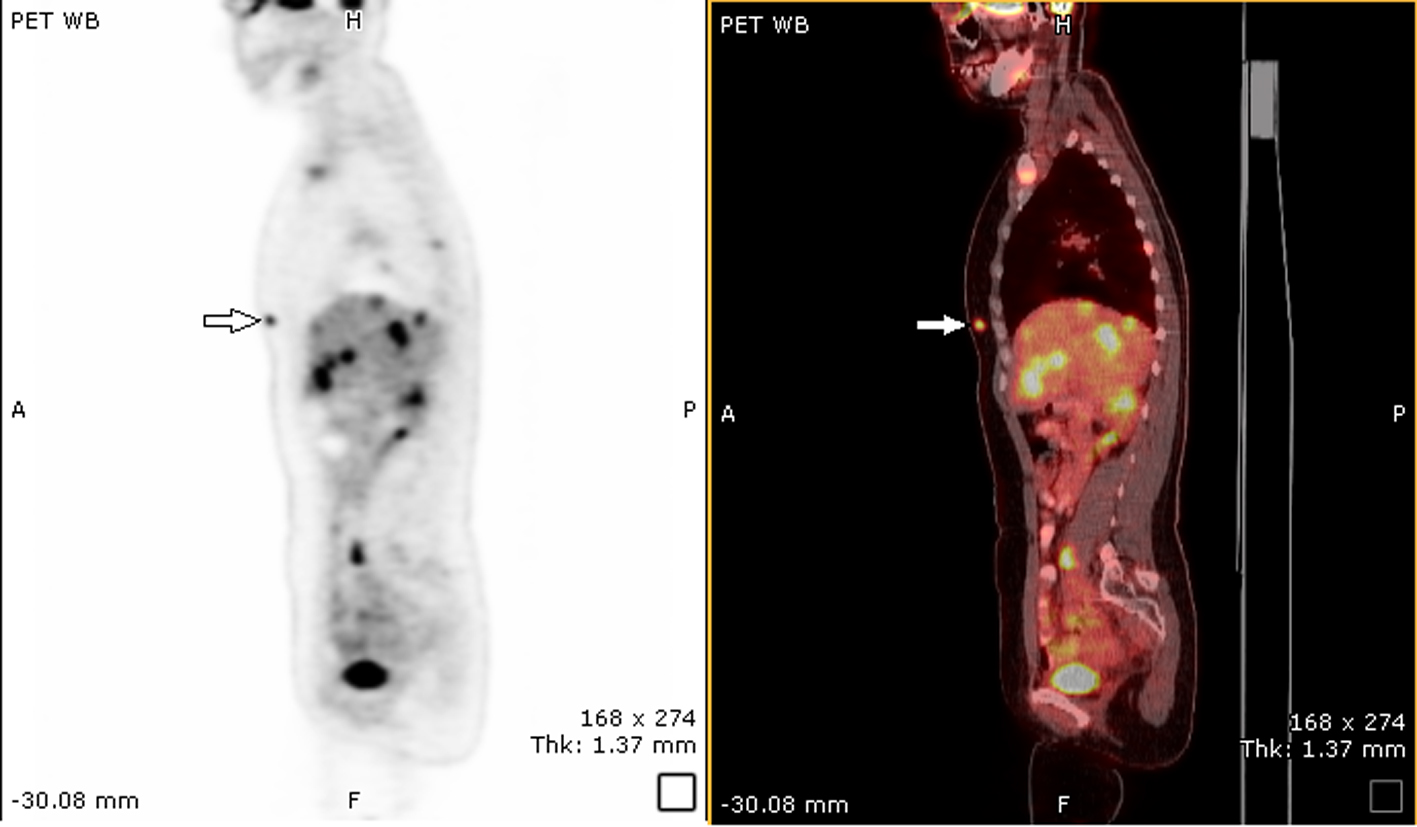 ![]() Click for large image | Figure 2. PET scan showing FDG uptake in right breast and liver. |