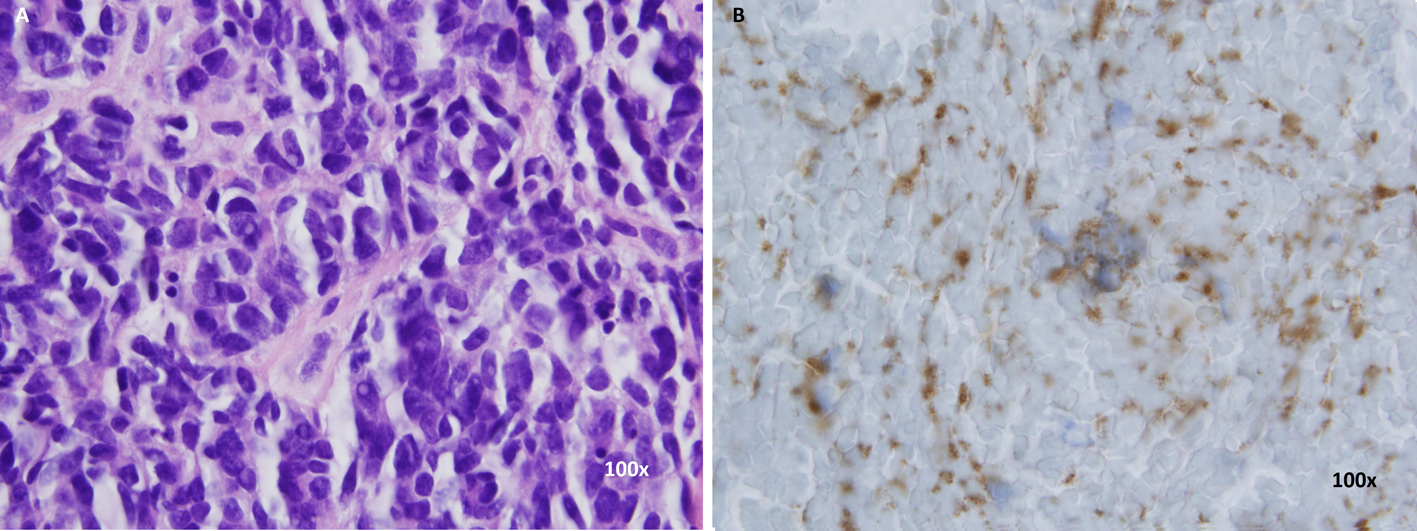 ![]() Click for large image | Figure 1. (A) Hematoxylin and eosin (H&E) staining of cervical biopsy. (B) Synaptophysin staining of cervical biopsy. |