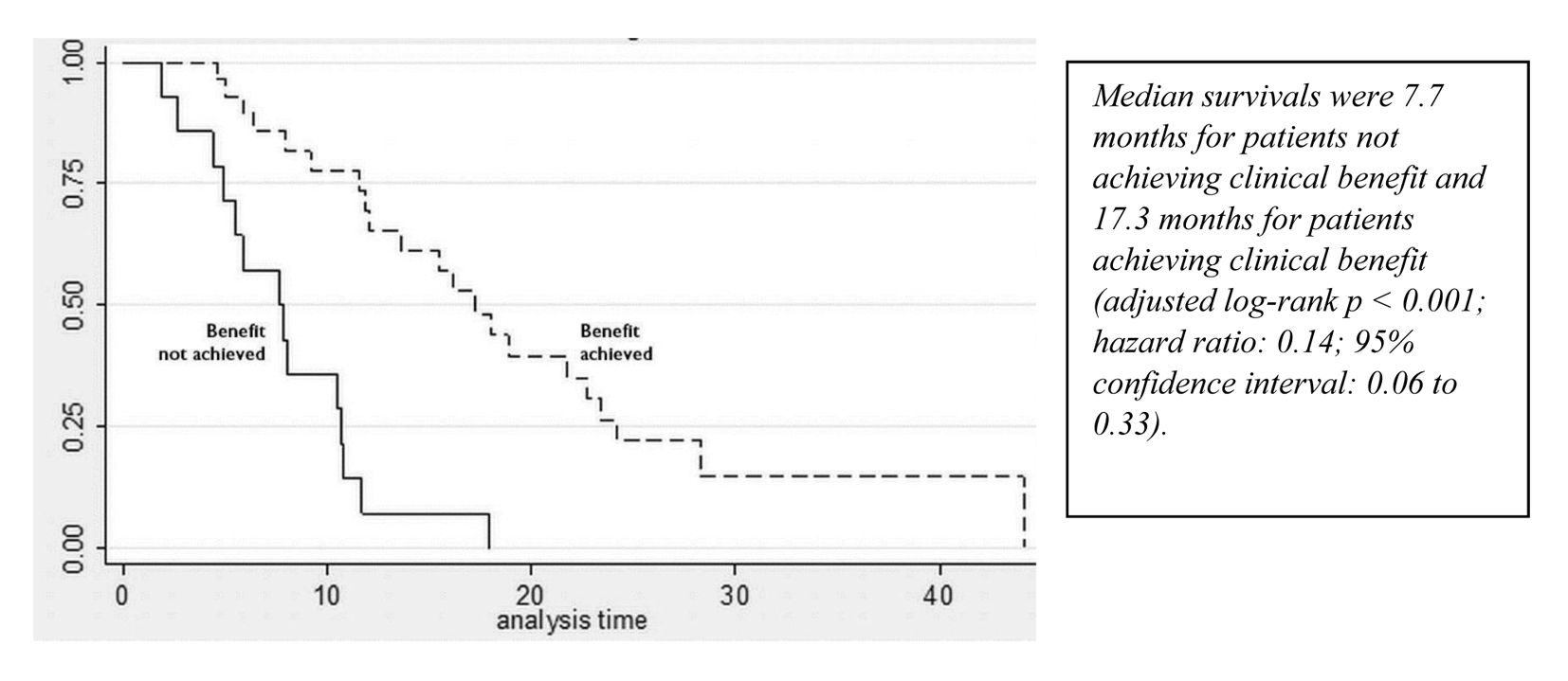 Several limitations in the present study need to be acknowledged. The small study population and retrospective nature of the analysis represent significant limitations in interpreting its results. Clinical benefit was based on clinical and radiologic assessments (for example, computed tomography imaging) of patients, which were requested by the treating physicians at variable points.