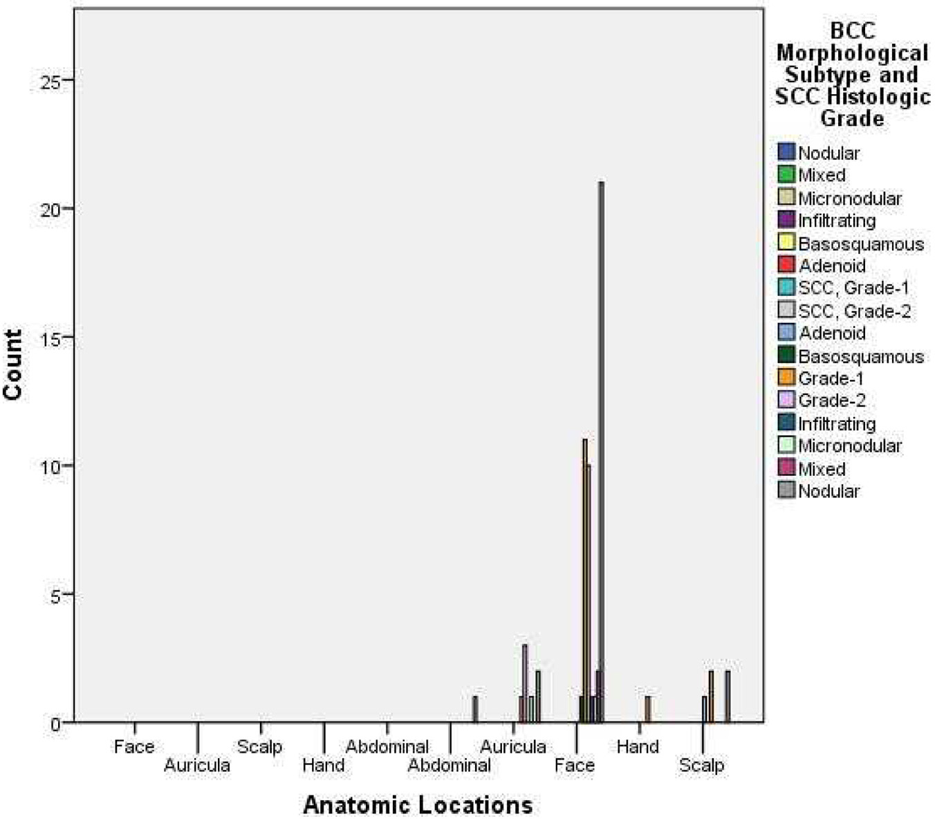 ![]() Click for large image | Figure 1. Distribution of BCC morphological subtype and SCC histologic grade. |