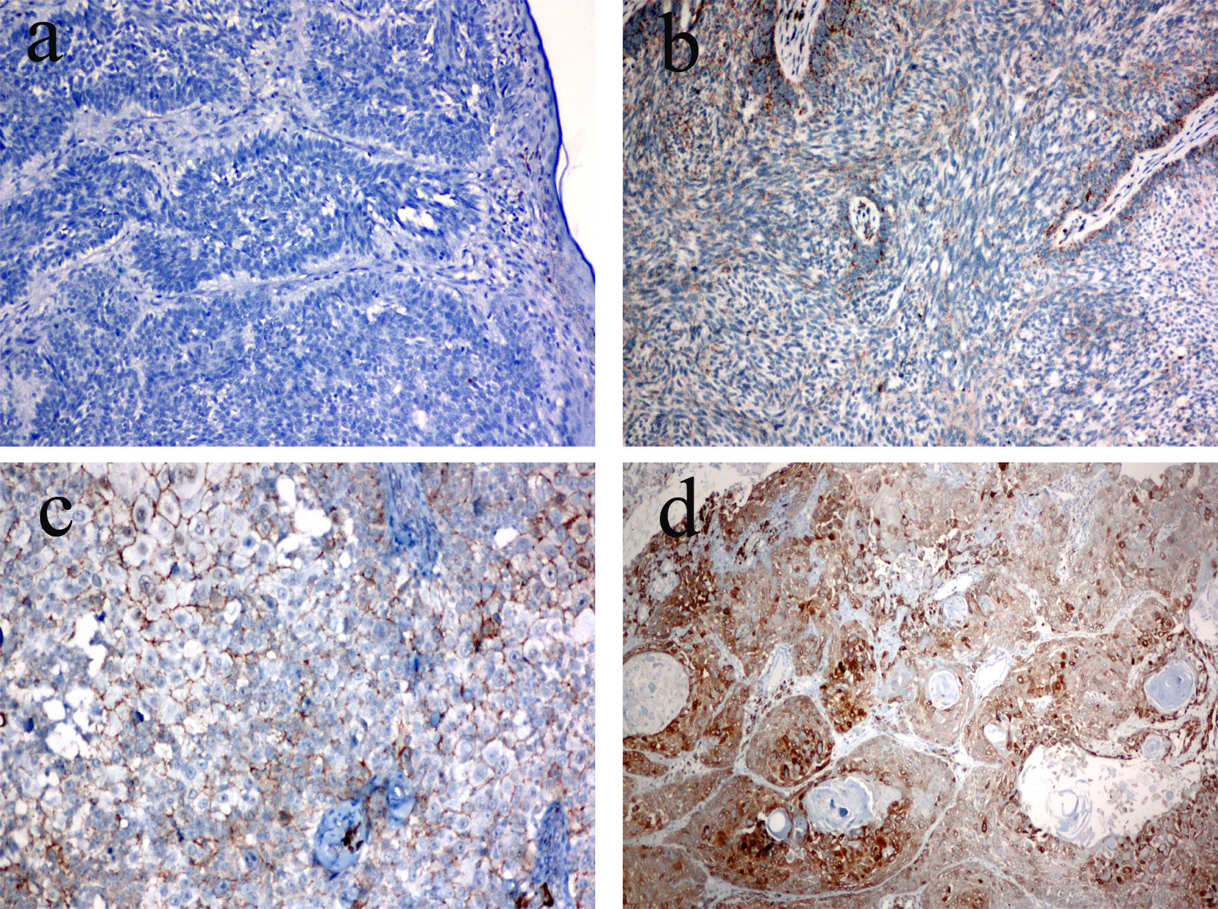 ![]() Click for large image | Figure 2. COX-2 expression in skin cancer. (a) Score 0 (no staining), BCC (× 20 objective). (b) Score 1 (weakly stained cells < 10%), BCC (× 10 objective). (c) Score 2 (moderately stained cells 10-90%), SCC (× 4 objective). (d) Score 3 (strong staining, > 90%), SCC (× 10 objective). |