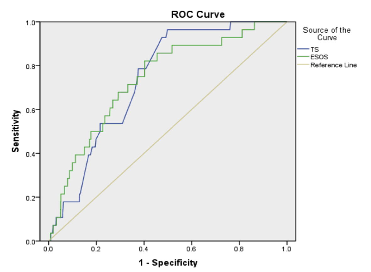 ![]() Click for large image | Figure 2. Receiver operating characteristic curve for thoracoscore (TS) and ESOS.01. |