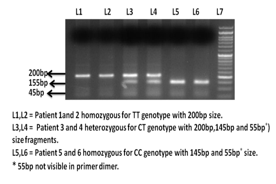 The amplification was accomplished with a 25 μL reaction mixture containing 5 μL of 20 ng template DNA, 0.25 μL of 25 pmol each primer, 2.5 μL 10 mM dNTPs, 1.5 μL of 20 mM MgCl2, 0.3 μL of 5 U/μL Taq polymerase with 2.5 μL of 10× Taq buffer (FD1224, Fermantas). The amplification conditions were 10 min of initial denaturation at 95 °C, 40 cycles at 95 °C for 45 s, annealing temperature at 60 °C for 45 s and 72 °C for 45 s with a final 10 min extension step at 72 °C. Amplified PCR product (15 μL) was digested with 1 μL of 10 × digestion buffer containing 3 units fast digestion DraIII ((FD1224, Fermantas). After 15 min digestion at 37 °C, the fragments were separated on a 2% agarose gel stained with ethidium bromide. TT homozygote presented a single fragment of 200 bp, the CC homozygote with DraIII restriction site was cut into fragments of 145 bp and 55 bp, whereas the heterozygous CT genotype presented all the three fragments as shown in Figure 1.