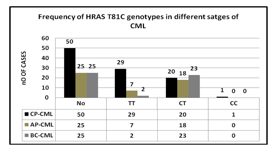 Results: In CML patients, the TT, TC and CC genotype frequency was 38%, 61% and 1% respectively, compared to 92%, 8% and 0% in healthy controls respectively. Compared to TT genotype, CT was significantly associated with increased risk of CML (odds ratio (OR): 8.4, P < 0.00001). There was a statistically significant correlation of H-RAS polymorphism with phases (P < 0.0003), molecular response (P < 0.0001), hematological response (P < 0.04) and thrombocytopenia (P < 0.003). However, there was no correlation of this polymorphism found with other clinical parameters.