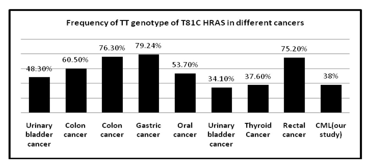 ![]() Click for large image | Figure 3. Frequency of TT genotype of T81C H-RAS in different cancers. |