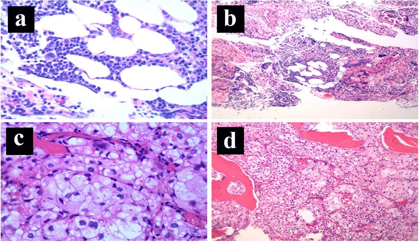 ![]() Click for large image | Figure 1. (a) Bone marrow: normal hematopoietic elements (H&E stain, × 100 magnification). (b) Bone marrow: normal hematopoietic elements (H&E stain, × 40 magnification). (c) Bone marrow: replacement of the normal hematopoietic elements by nests of cohesive epithelial cells with prominent clear cytoplasm surrounded by a capillary network, consistent with metastatic clear cell renal cell carcinoma (H&E stain, × 400 magnification). (d) Bone marrow: diffuse replacement of the normal hematopoietic elements by metastatic clear cell renal cell carcinoma (nests of cohesive epithelial cells with prominent clear cytoplasm containing a rich capillary network, H&E stain, × 40 magnification). |