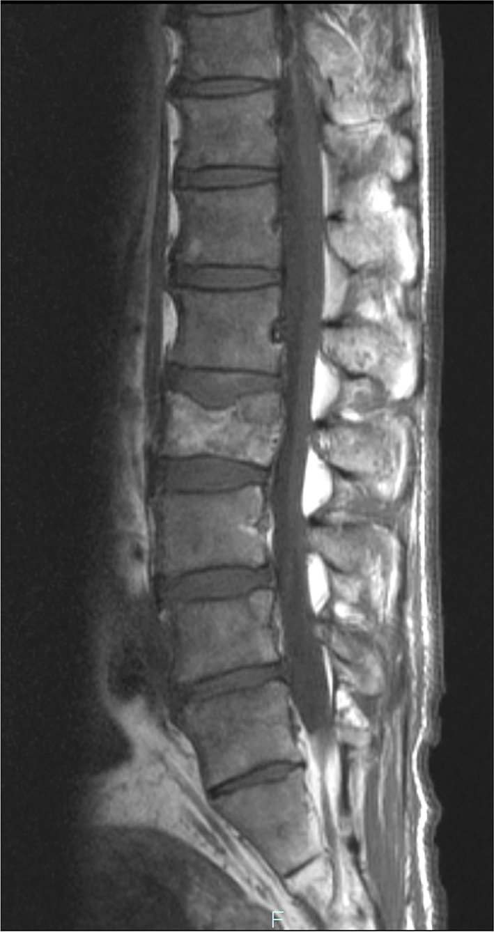 ![]() Click for large image | Figure 1. Spinal MRI. T1-weighed MR image showed metastatic lesions spread widely in the vertebral bodies. |