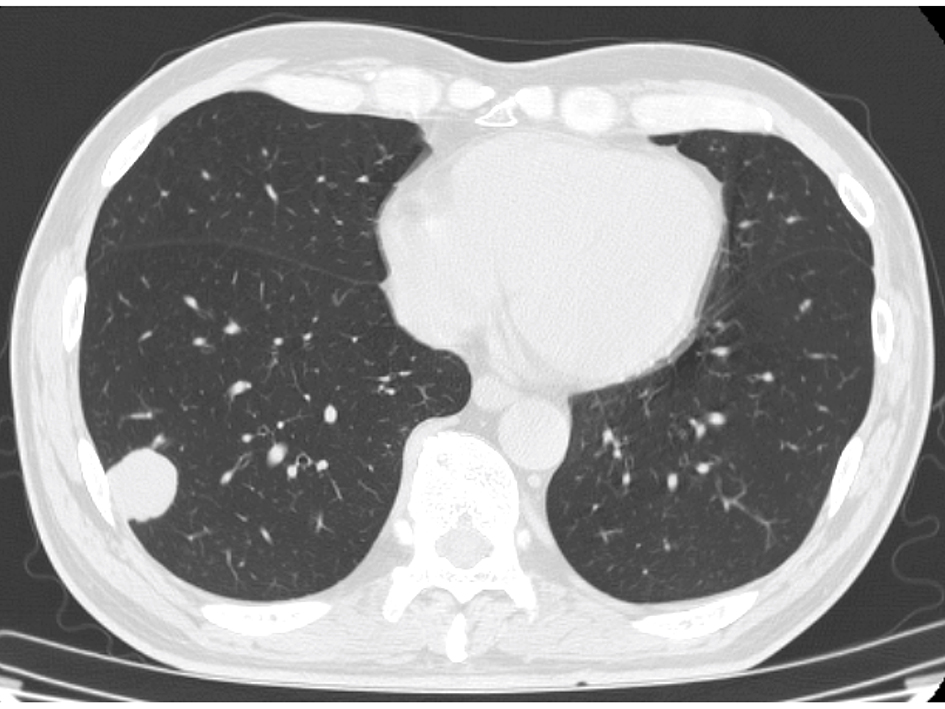 ![]() Click for large image | Figure 2. Chest CT. A well-defined right lung tumor of 25 mm in diameter. |