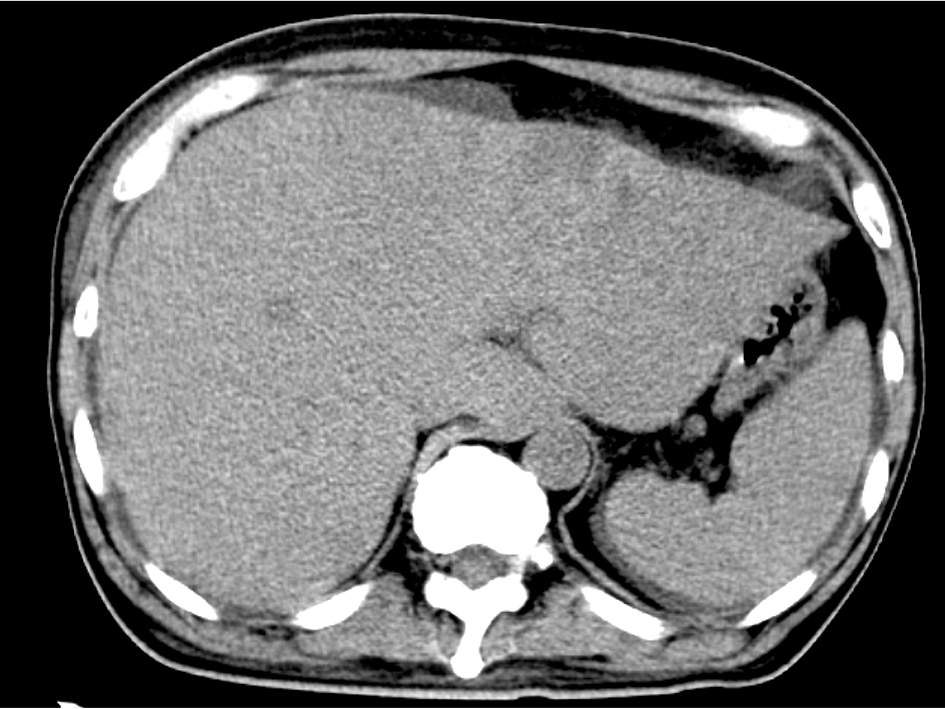 ![]() Click for large image | Figure 3. Abdominal CT. Diffuse hypo-density area in the swelled liver with ascites. |