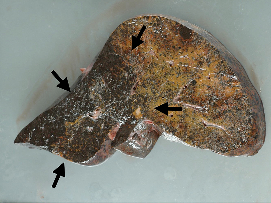 ![]() Click for large image | Figure 4. Macroscopic view of liver cut surface. Blackish swelled liver showed diffuse metastatic melanocyte invasion (arrows). |