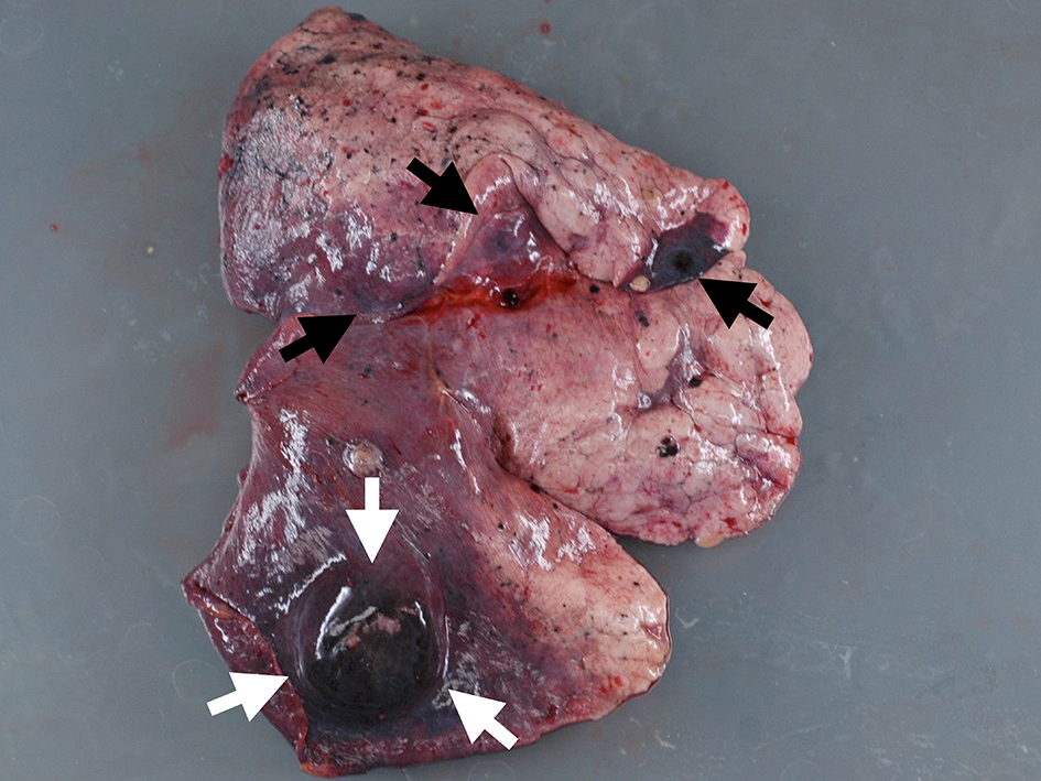 ![]() Click for large image | Figure 5. Macroscopic view of lung lesion. Well-defined metastasis (white arrows) was accompanied with multiple metastases (black arrows). |