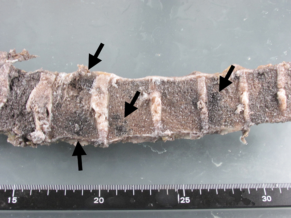 ![]() Click for large image | Figure 6. Macroscopic view of lumber spine. Metastatic lesions were spread in the vertebrae (arrows). |