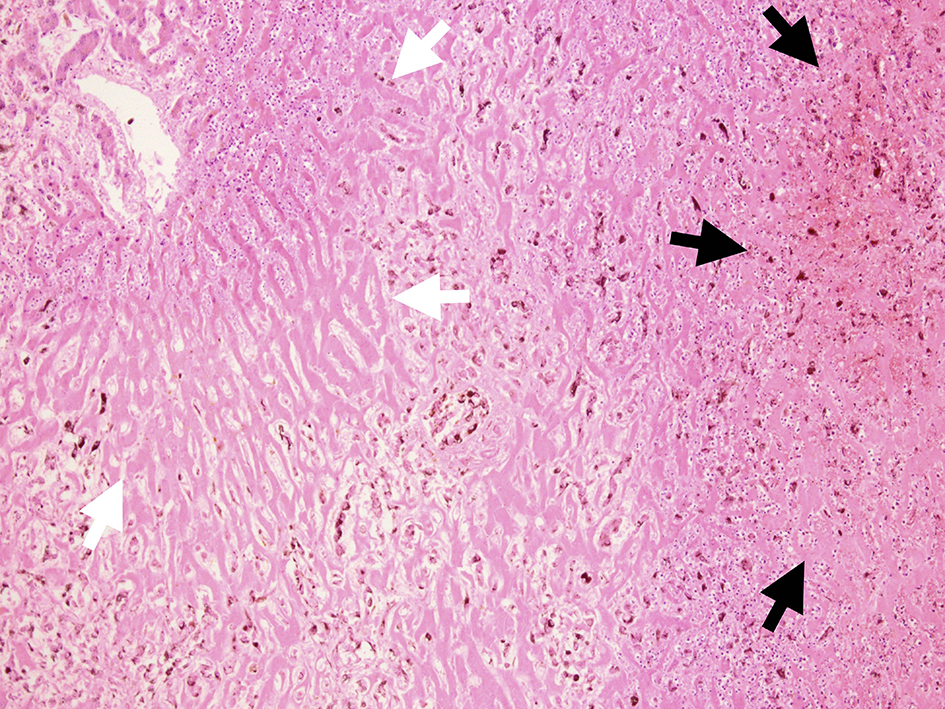 ![]() Click for large image | Figure 7. Microscopic view of liver cut surface. Centrilobular necrosis without bleeding (white arrow) and perilobular necrosis with hemorrhage were shown (black arrow). Diffuse invasion of atypical melanocytes was observed. |