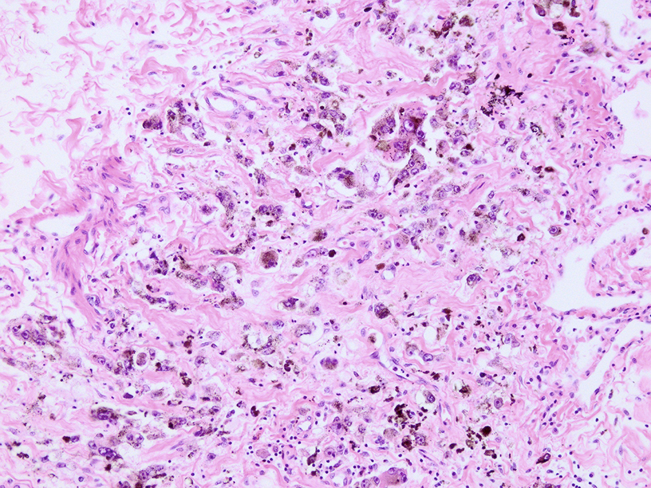 ![]() Click for large image | Figure 8. Microscopic view of lung lesion on autopsy. Lung metastasis with diffuse necrosis taken by autopsy was shown. |