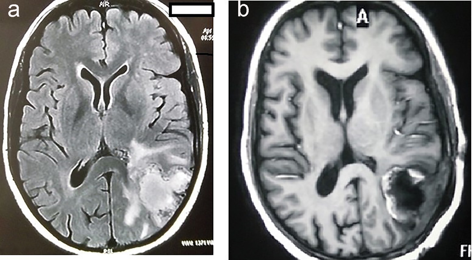 ![]() Click for large image | Figure 1. MRI of brain showing hyperintensity in the parieto-occipital lobe of brain (a). MRI of brain showing postoperative defect after complete excision of tumor (b). |
