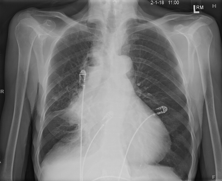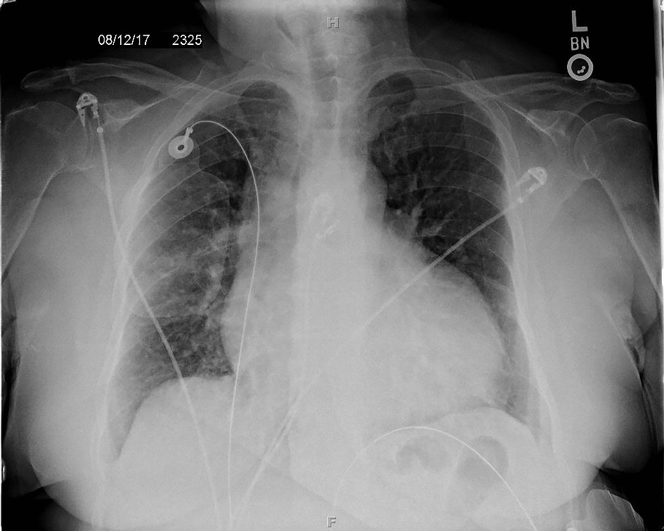 Figure 6. Posterior-anterior chest X-ray showing cavitary lesion with an air-fluid level in the right upper lobe and an enlarged cardiac silhouette.
