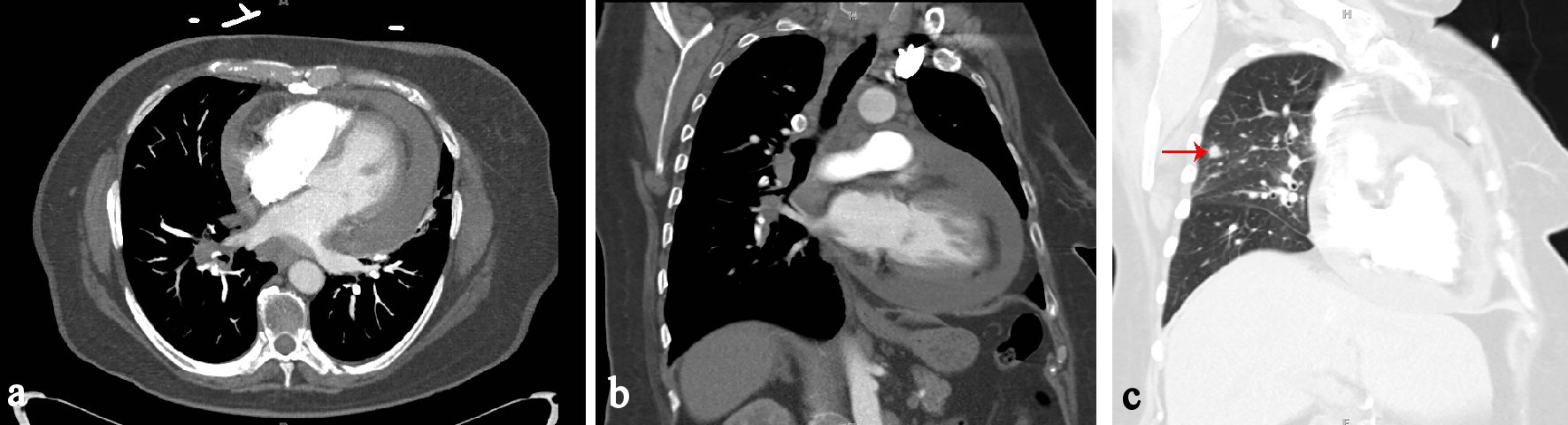 Figure 3. (a) CT chest axial view showing pericardial effusion. (b) CT chest coronal view showing pericardial effusion. (c) CT chest coronal view in lung window showing 7 mm nodule in right upper lobe (red arrow).