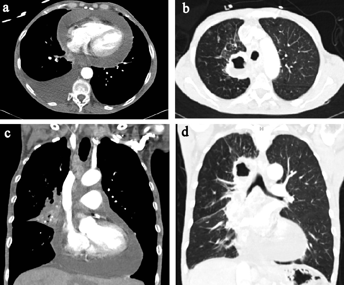 Figure 7. (a) CT chest axial view showing pericardial effusion. (b) CT chest axial view showing in pulmonary window showing air filled cavity with air-fluid level. (c) CT chest coronal view showing pericardial effusion. (d) CT chest coronal view in pulmonary window.