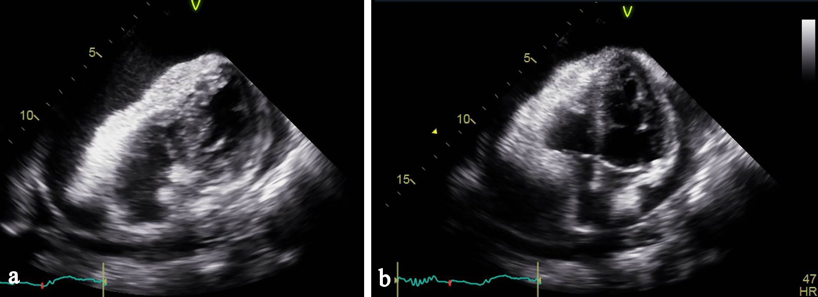 Figure 8. (a) Echocardiogram apical view showing right ventricular collapse in diastole. (b) Echocardiogram apical view showing right atrial collapse in diastole.